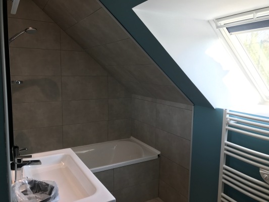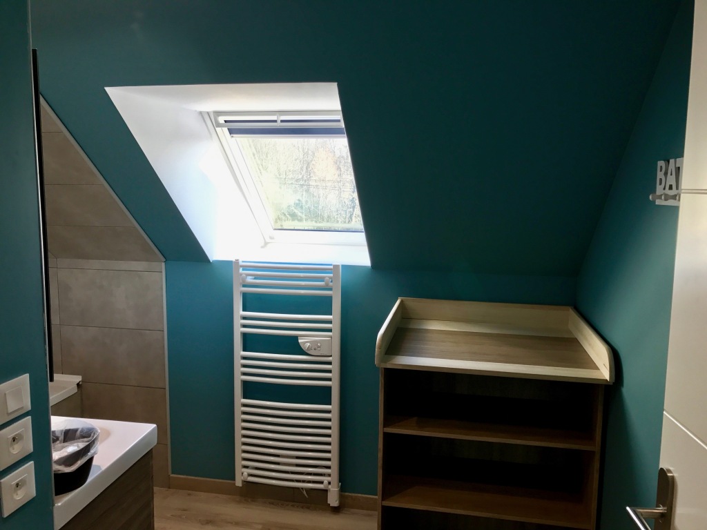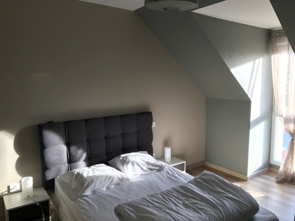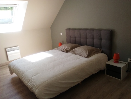 On the 1st floor, the night part includes 3 beautiful rooms of 14m2, 2 of which with 1 bed of 2 persons 160*200, wall cupboard, velux with blind and 1 with 1 bed of 2 people 140x190, wall cupboard, skylight with electric shutters. 1 bathroom with bath and WC