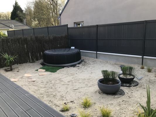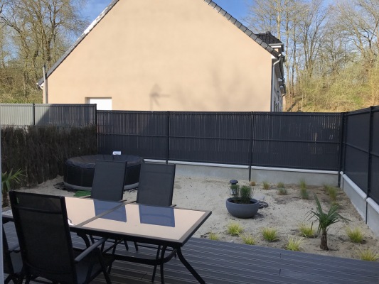 EXCEPTIONAL location, with sand garden. Composite wood terrace of 22 m2 to have delicious meals in summer and SPA (Jacuzzi for 6 persons) offering you moments of plenitude and refreshment during sunny days.