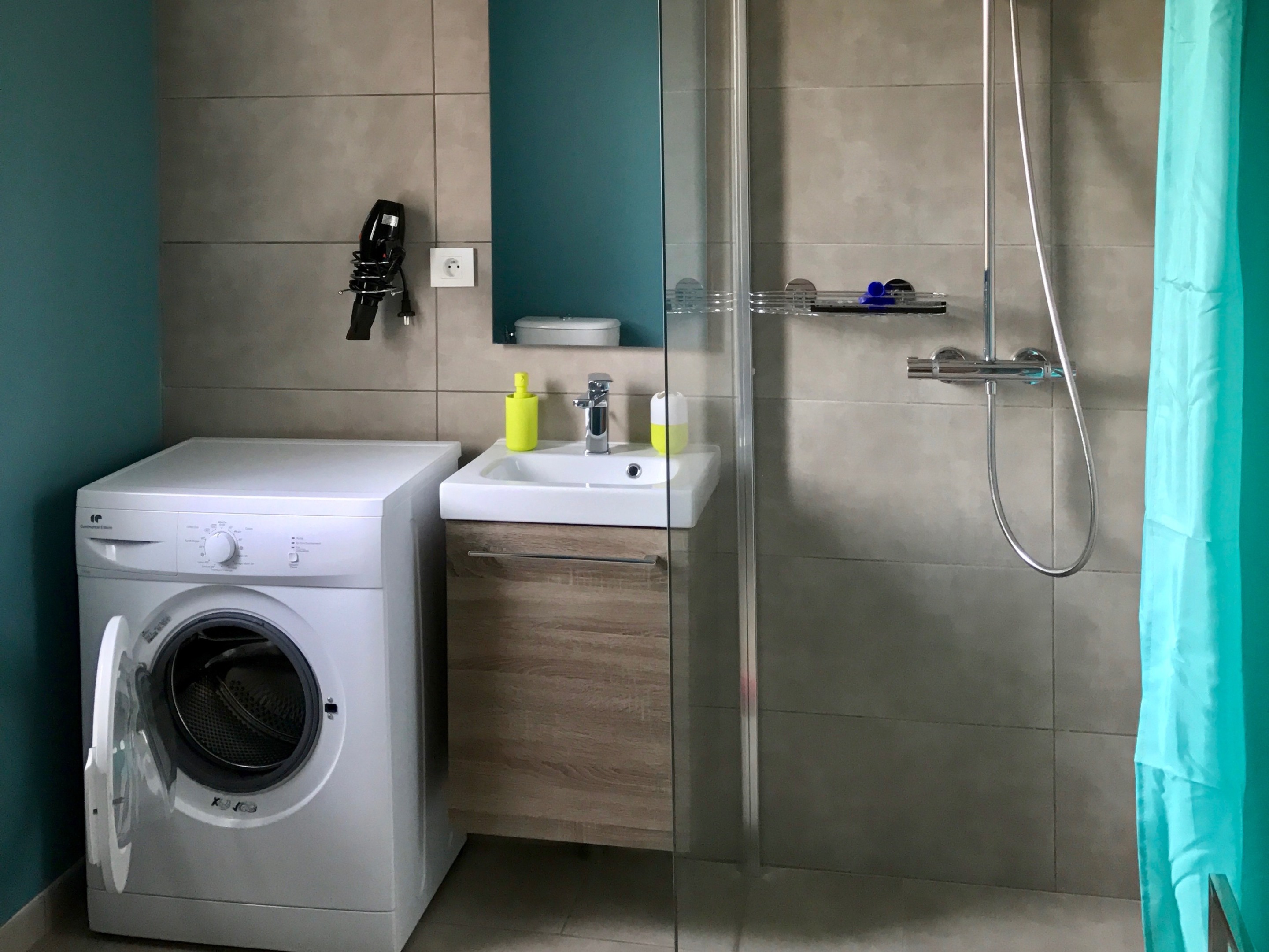- Shower room with walk-in shower, vanity unit, raised toilet, hairdryer and washing machine.