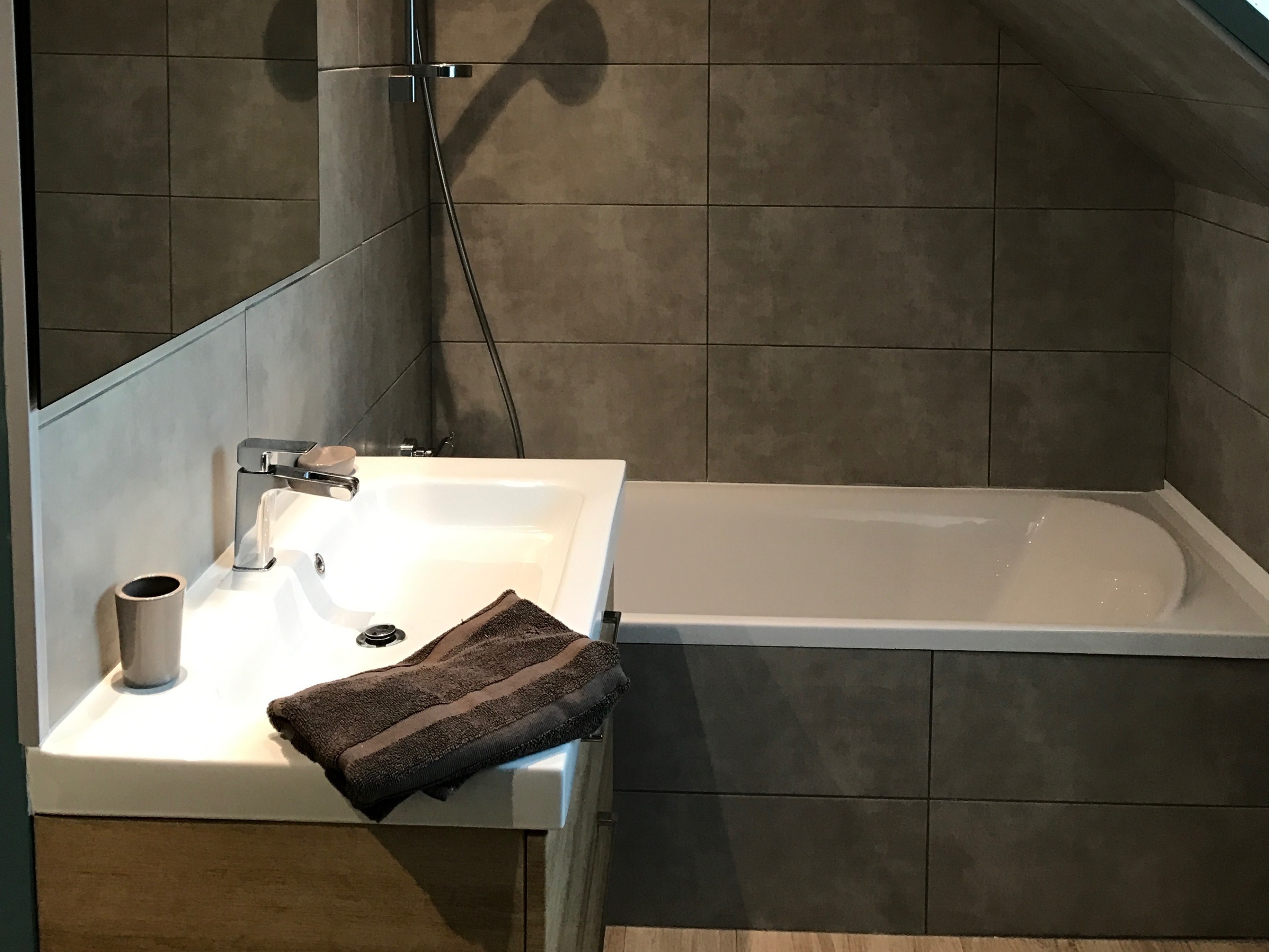 On the 1st floor, the sleeping area including 3 beautiful bedrooms of 14m2, 2 with 1 double bed 160 * 200, closet, velux with blind and 1 with 1 double bed 140x190, closet, skylight with electric shutters. 1 bathroom with bathtub and WC